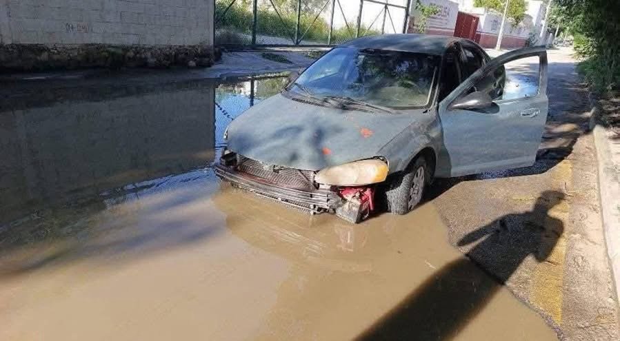 Un automóvil terminó dentro de un enorme bache cubierto por agua estancada en la calle 23 entre 54 y 56, cerca de Noreña, en el fraccionamiento Paseos de Itzincab.