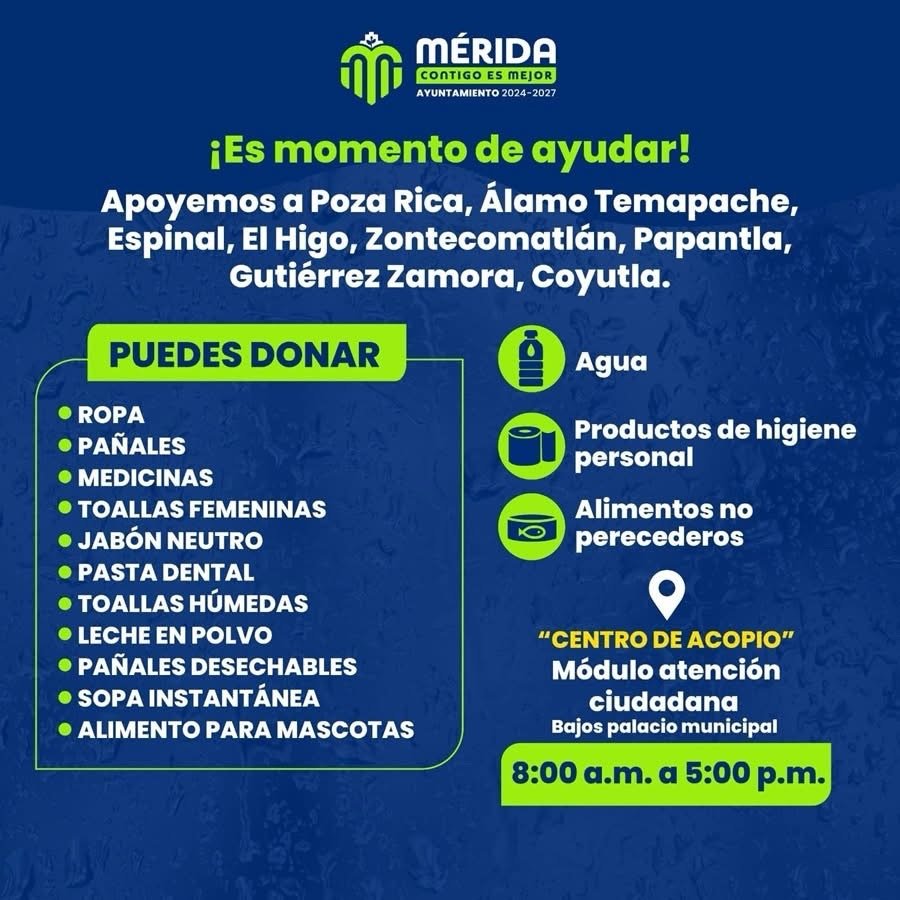 El Ayuntamiento de Mérida se unió a la labor humanitaria para apoyar a las familias afectadas por las intensas lluvias y severas inundaciones en el estado de Veracruz, donde varias comunidades, especialmente Poza Rica, se encuentran en situación crítica.