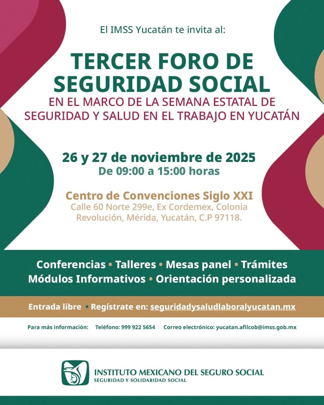 El Instituto Mexicano del Seguro Social (IMSS) en Yucatán anunció la realización del Tercer Foro de Seguridad Social, que se llevará a cabo los días 26 y 27 de noviembre en el Centro de Convenciones Siglo XXI, como parte de la Semana Estatal de Seguridad y Salud en el Trabajo 2025, organizada por la Secretaría de Economía y Trabajo (SETY). El acceso será gratuito.