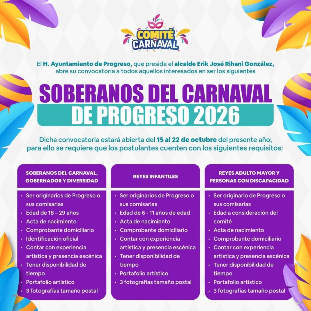 El ayuntamiento de Progreso, encabezado por el alcalde Erik Rihani González, a través del Comité Organizador del Carnaval de Progreso 2025-2026, lanzó la convocatoria oficial para elegir a los próximos representantes del Carnaval de Progreso 2026.