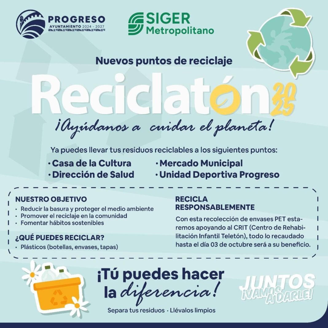 Con el objetivo de sumar esfuerzos para alcanzar la meta estatal de 15 toneladas de PET tipo 1, el Ayuntamiento de Progreso, encabezado por el alcalde Erik Rihani González, se une al “Reciclatón 2025”, una iniciativa a beneficio del Centro de Rehabilitación e Inclusión Infantil Teletón (CRIT) Yucatán.