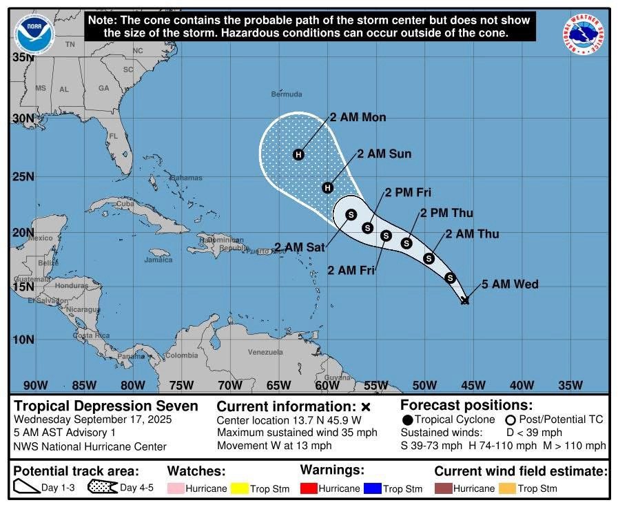 El Centro Nacional de Huracanes (CNH) de Miami informó la mañana de este miércoles sobre la formación de la Depresión Tropical Siete en aguas del Atlántico central, muy lejos de la Península de Yucatán, por lo que no representa peligro para la región.