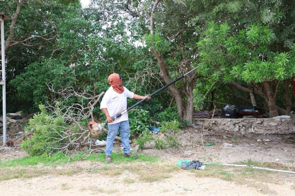En seguimiento a este plan integral de trabajo, también se realizaron labores de poda de árboles y limpieza de maleza en la cancha de fútbol “La Curva”, ubicada en la calle 38 por 29 y 31, con el propósito de recuperar este espacio que no había recibido mantenimiento por un periodo prolongado.